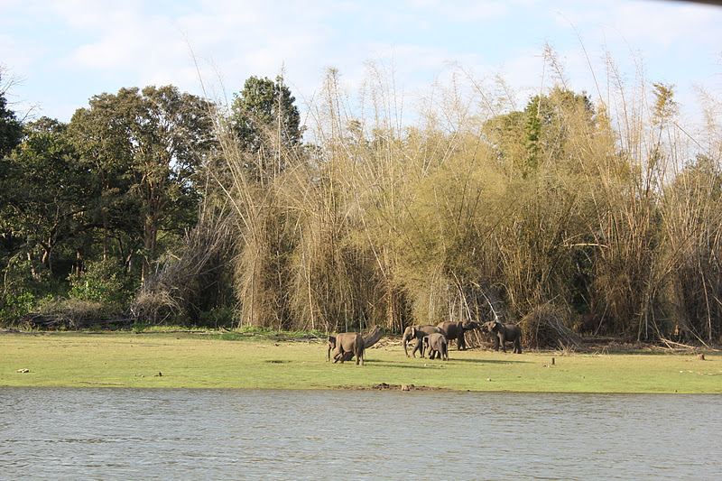330pm boat safari - 2hrs 45min. We saw 24 elephants, loot of birds, spotted deer, sambha, wild pigs, beautiful peacock. All the elephants were kicking their right front leg against the grass, pulling it out and cleaning the mud from the grass. Our guide Arjun told us that they were doing this to clean the grass and eat them. Sunset from the boat was again very beautiful, more pictures, back and masala chai with snacks. Forest video at 730pm, dinner and sleep :)