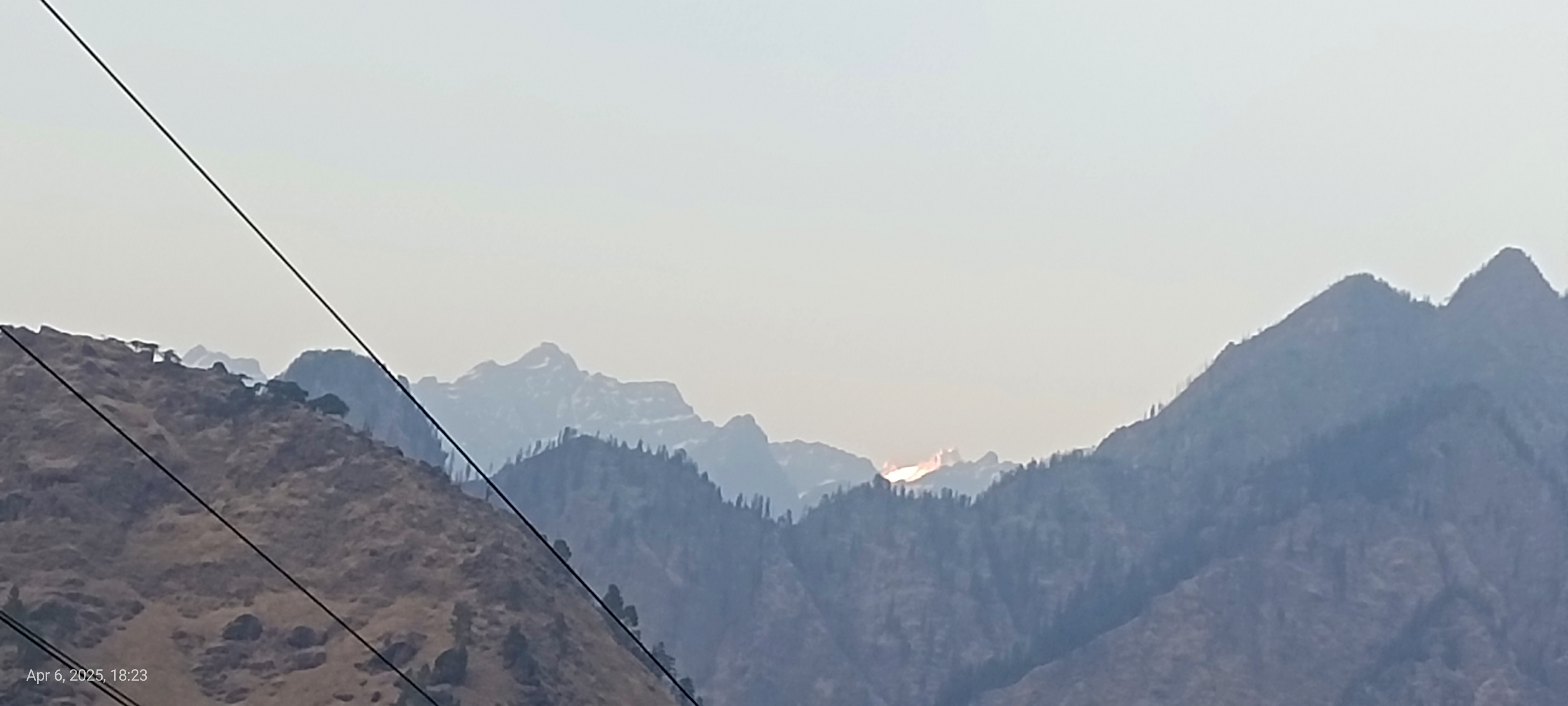 I woke up at 5 am to the sound of many birds chirping, including Monals. We actually heard a Monal almost every morning. I freshened up and walked around. The sky was very clear that morning. I stood facing the mountains waiting for the sunrise while having lemon tea. It was a joy to see the sky and mountains change colour with the sunrise. We walked around, watching various birds and mountains. We could see the top of the 'Neelkant' mountain clearly. We had a leisure breakfast - upma, egg burji, papaya, apple and pasta with veggies. Kids enjoyed the pancakes made in the mountains. I had my coffee and started packing. We left Khulara around 9.30 am after thanking the amazing staff and taking a group picture with them. There were 6 of them altogether including our guides Vipin and Sanjay.